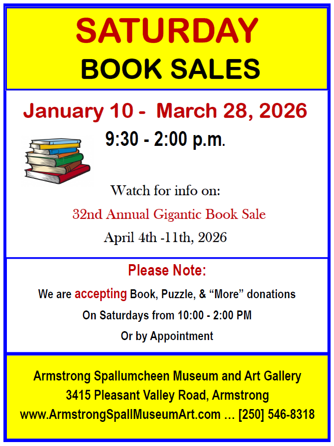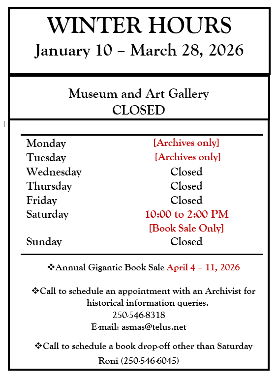 In the early 1970’s residents of Armstrong found themselves powerless to save an historic building from being demolished. This event was the spark that led to the creation of the Armstrong Spallumcheen Historical Society, incorporated in 1974. In the beginning, the Society’s collection consisted mainly of historical photographs. Almost a decade later the City of Armstrong offered the Society space in part of a machine storage building. The Society opened a museum to the public in 1983. In 1988, with the help of a gift from Rusty Freeze, they expanded into the rest of the building and added an Art Gallery. At this time the name of the Society changed to the Armstrong Spallumcheen Museum and Arts Society. The museum and art gallery are the result of the dedication of the many volunteers from the community who continue to be active in it’s operation.